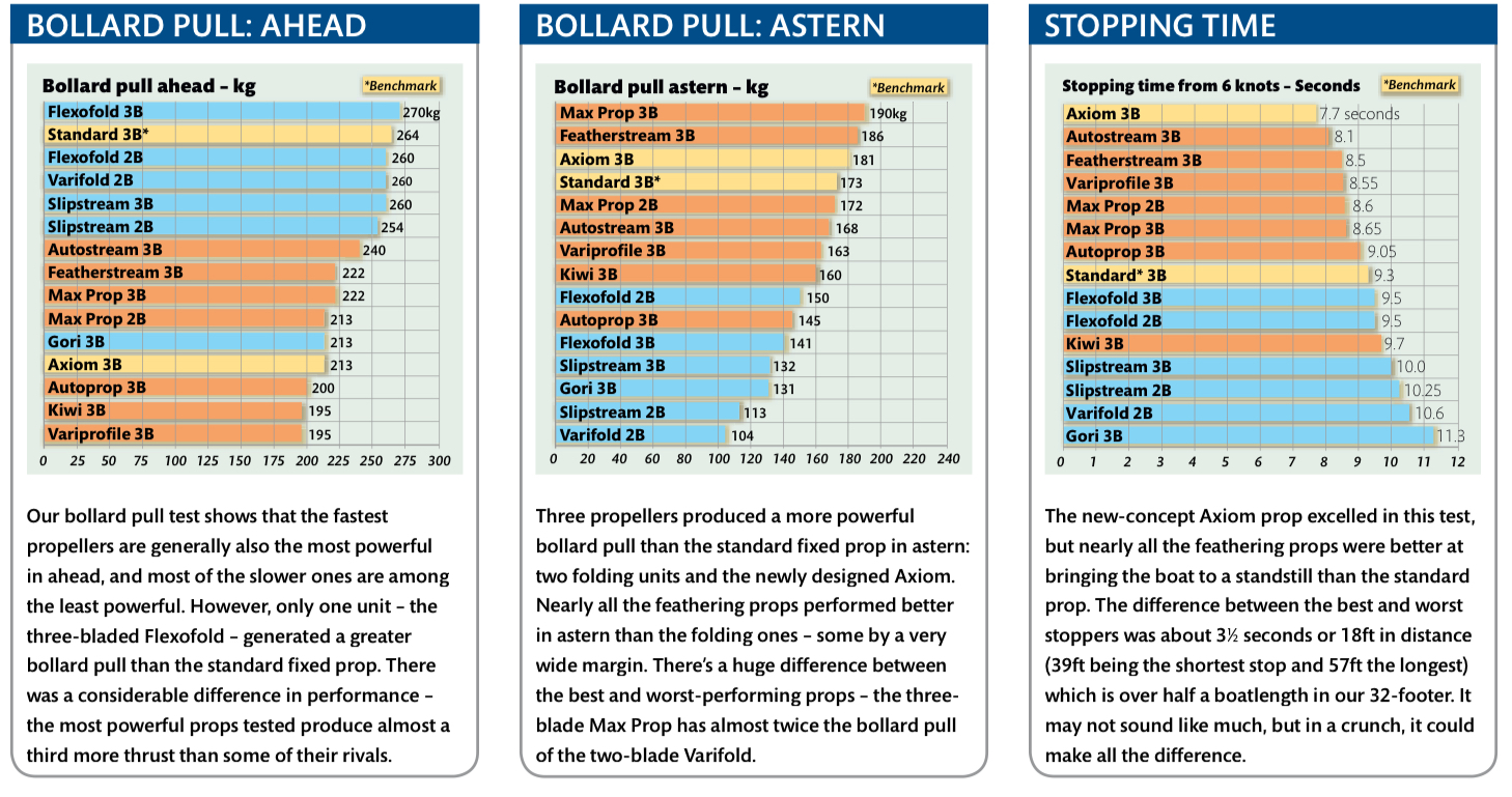 Efter lite letande hittade vi ett djuplodande propellertest från Yachting Monthly, publicerat i maj 2009. Inför testet bad tidningen ett antal propellertillverkare att rekommendera den bästa propellern för deras testbåt. Därefter testades varje propeller på samma båt och under samma förhållanden. Resultatet visas här: