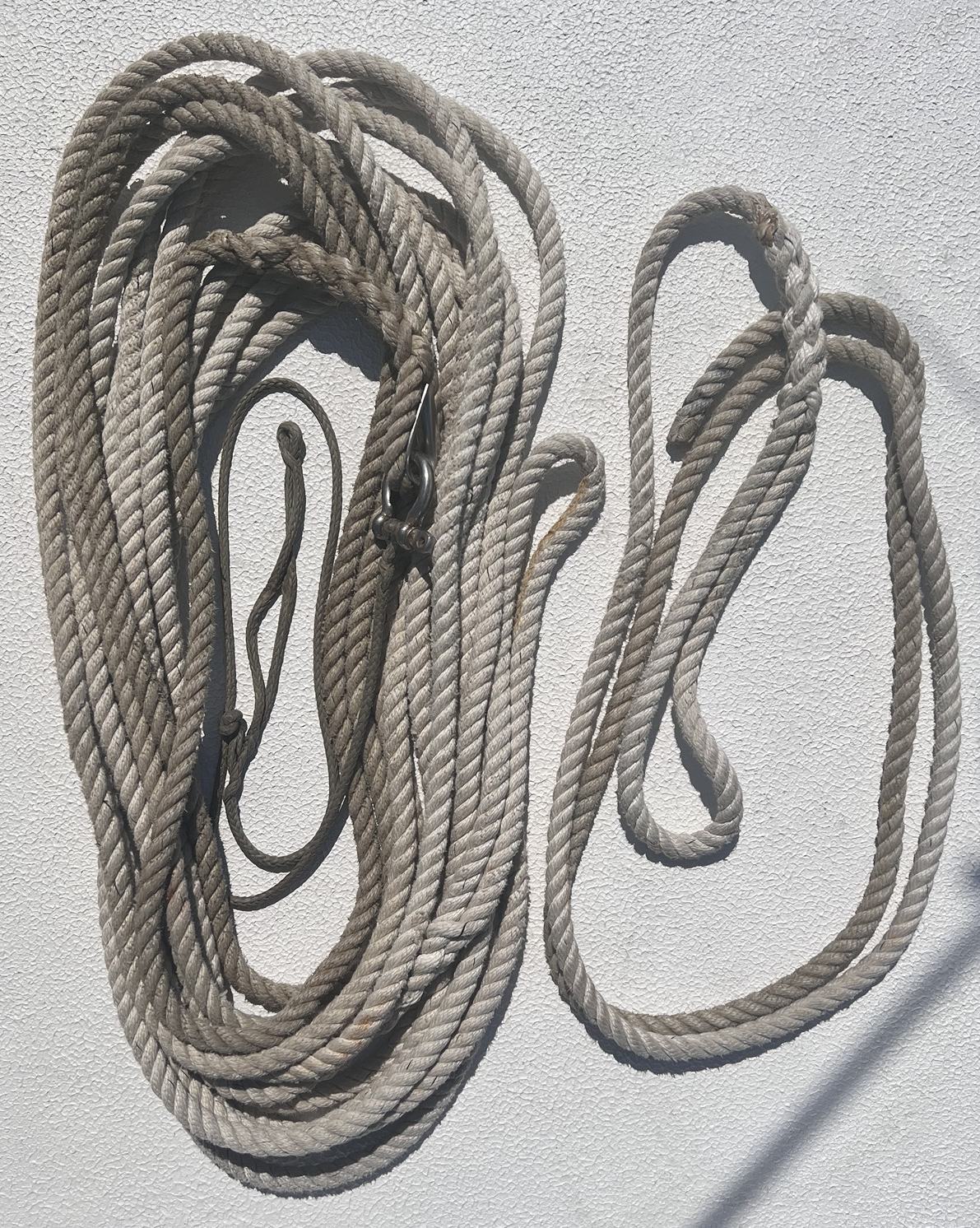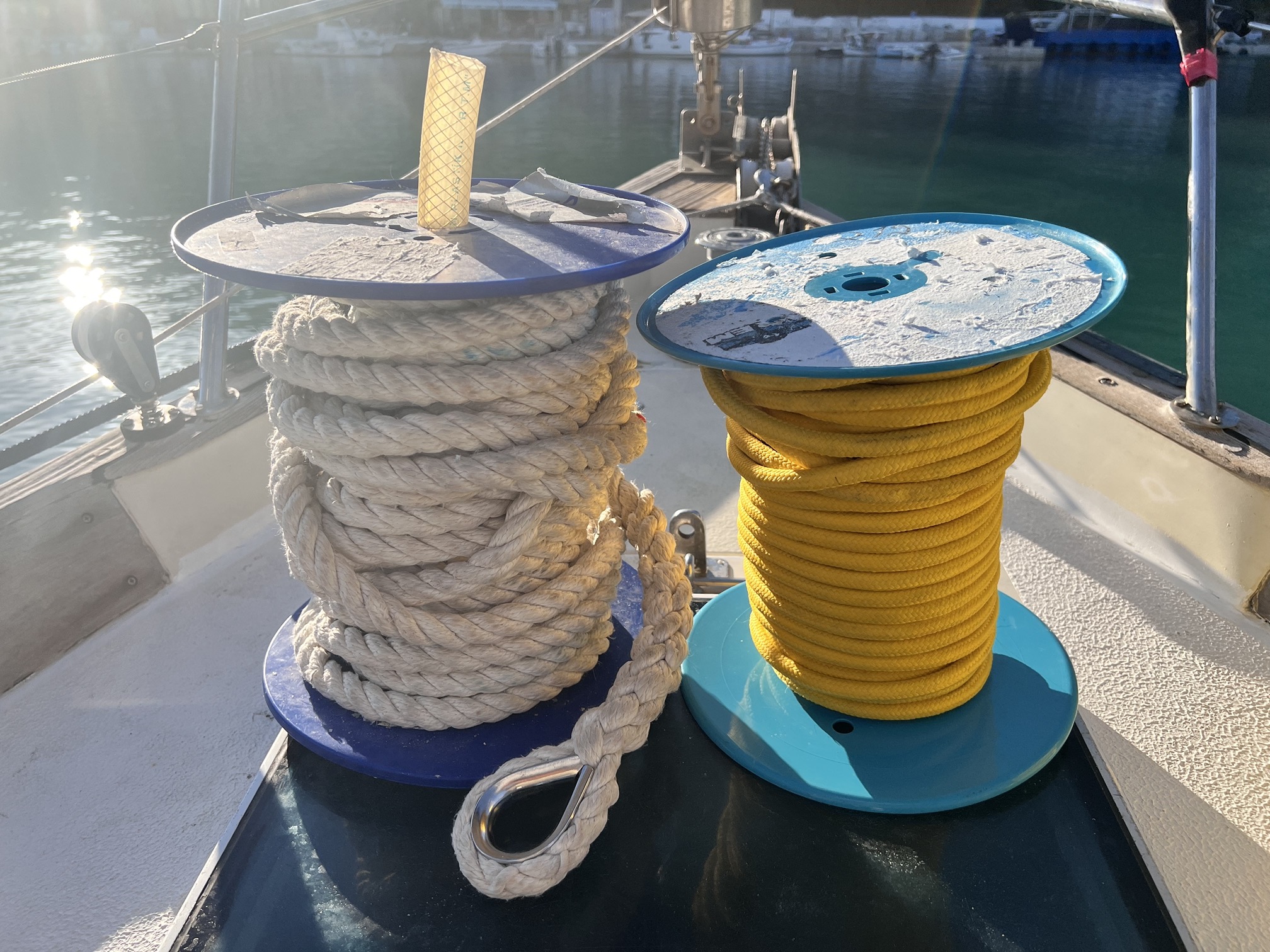 Vi har lite blandade tampar som används när vi behöver lägga akterankare eller binda mot land. Vi har minst 2 tampar som flyter som är runt 40m långa som är lättillgängliga sen ligger det såklart några rullar med tamp som inte flyter som är minst lika långa undanstuvade om det skulle behövas.
