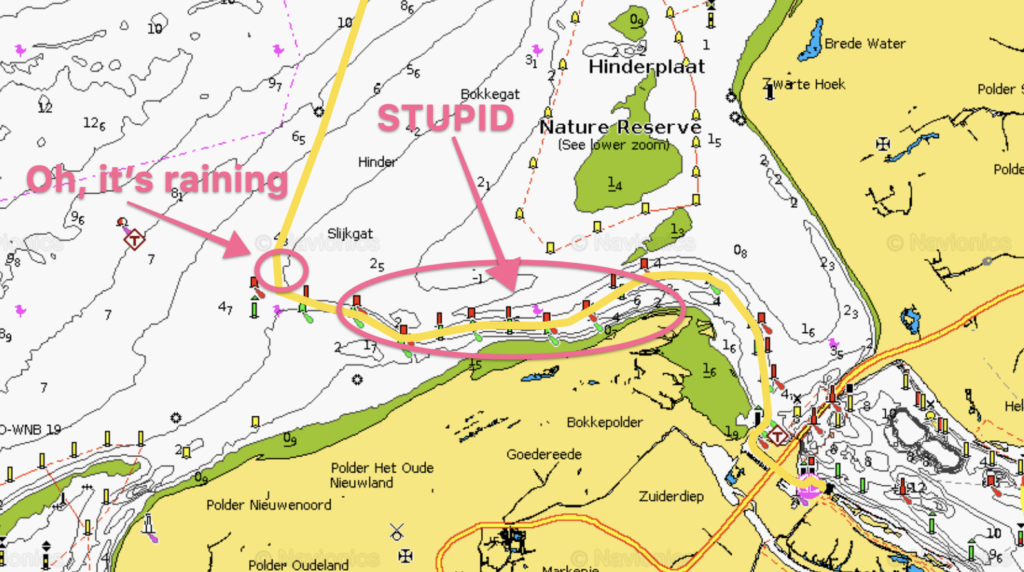 We of course tried to reef our headsail but according Murphy’s law it got twisted with our spinnaker halyard right away so we had a full set of sails going downwind in almost 9 knots. Due to the rain that also went from rain till insane with a mix of hail with a size of small olives the visibility went from okey to absolutely none, nothing, njada. We couldn’t see the shores and we couldn’t see the next navigation mark we barely could see the bow of the boat, the only thing we knew was that the distance to the shoreline was about 100 meters or less and that the canal was far from that wide so we had to rely on our GPS plotter to guide us.