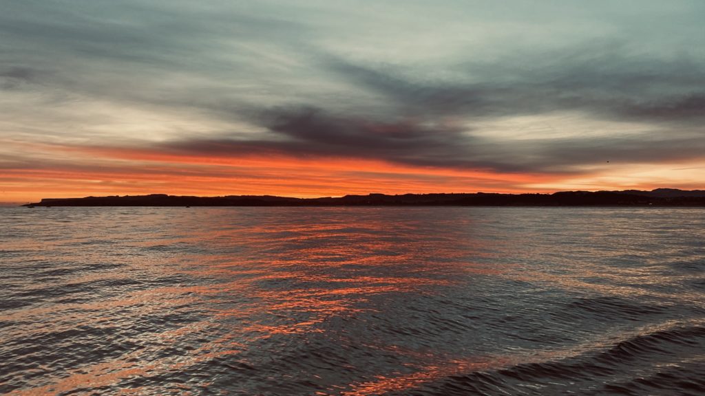 When we got out of the harbor we got greeted by a a magic sunrise but we canât stop thinking of the old red sky saying.