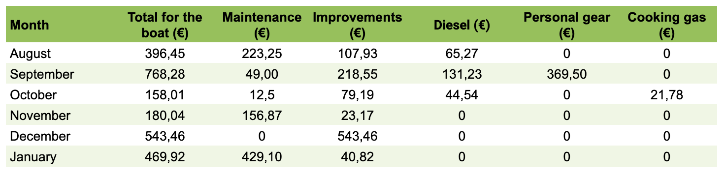 A common recommendation when it comes to boat costs is to have a yearly budget of 10-20 % of the value of the boat. If we keep the same pace on our boat expenses the next six months as we did the first six months we will definitely exceed that. During the first six months we spent 2516 € on the boat. However about 40 % of that was improvements and the need for improvements will hopefully be less and less with time. We have split the costs into five subcategories: maintenance, improvements, diesel, personal gear and cooking gas.
