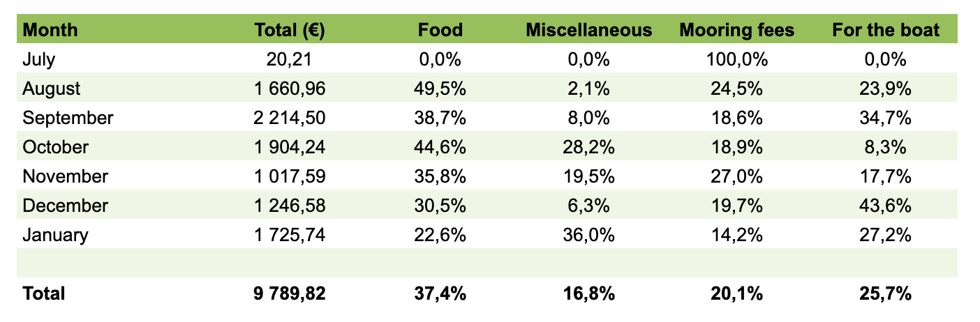 We didn’t make a budget for each category but the overall plan was to not spend more than an average of 2000 €/month. With a total amount of 9790 € for six months we get an average of 1632 €/month. The cheapest month was November with 1018 € spent and the most expensive month was September with 2215 € spent. We feel quite comfortable with that we will be able to stick to the plan with 2000 €/month as an average. Every month that we spend less than that gives us a buffer for more expensive months. And there will definitely be more expensive months. We will probably spend a few months in the Mediterranean this summer and the mooring fees there are really expensive but hopefully we will be able to anchor more. But eventually we will need to get new sails or fix something expensive on the boat so being able to build up a buffer is quite nice.