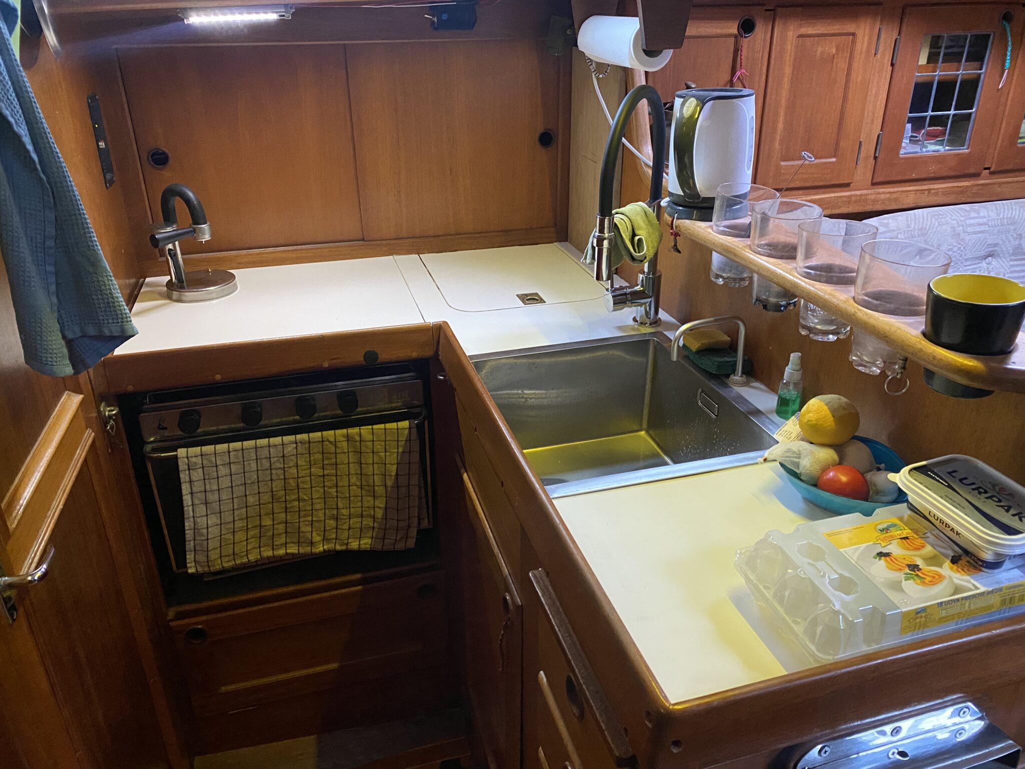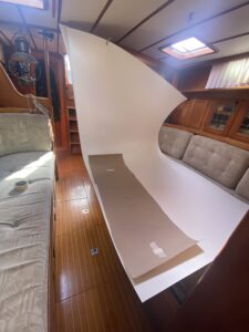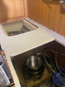 Efter många mail fram och tillbaks med Formicas återförsäljare på Sicilien som inte kunde mer än “Hello” på engelska slutade det hela med att vi, på italienska, lyckades beställa tre vita skivor (de ska även räcka till att piffa toaletten/badrummet) för 160€ + 50€ i frakt som efter någon vecka låg så fint i båten och tog plats.