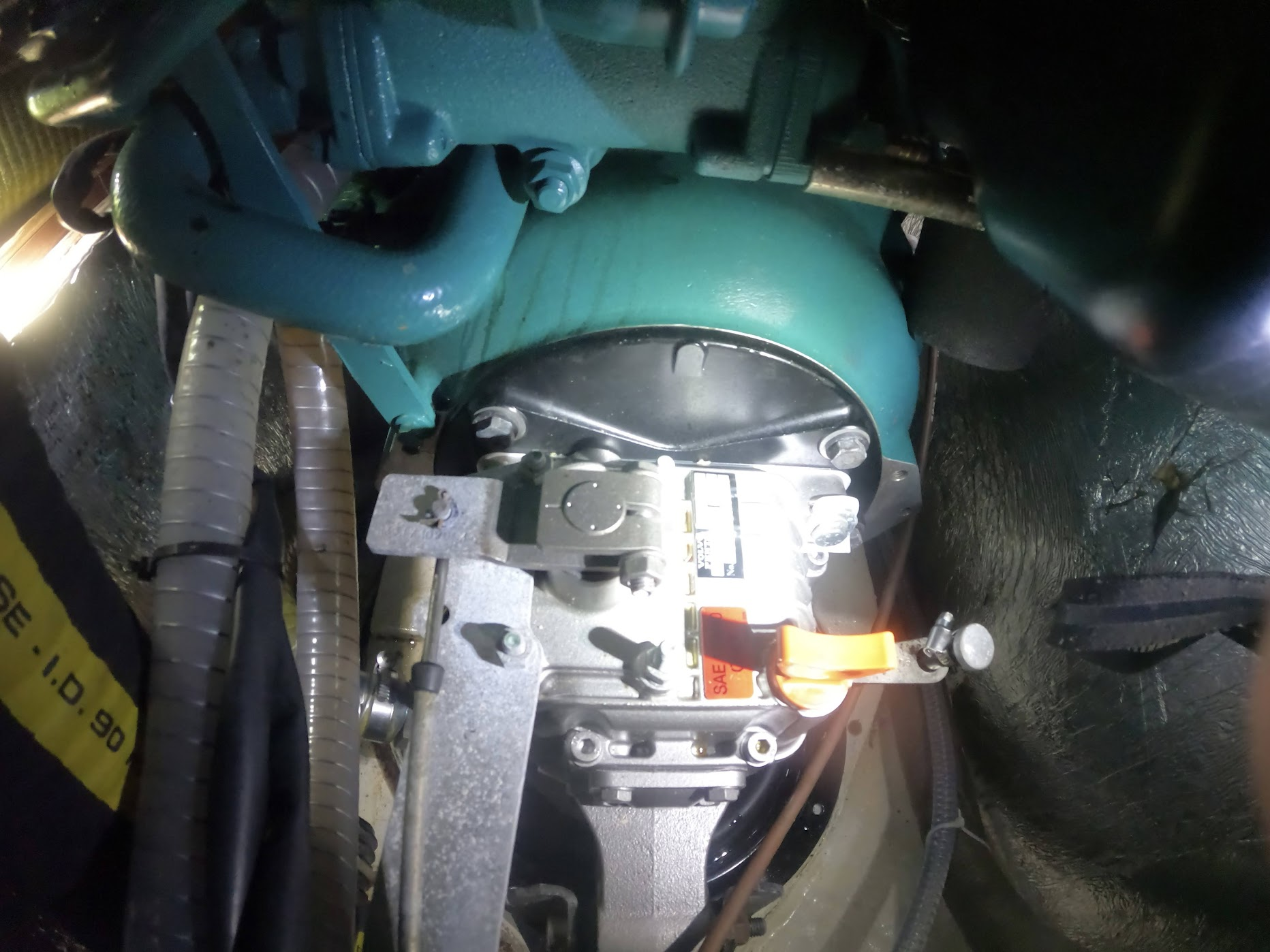 Malö 116, båten vi seglar, har ett hyfsat stort motorrum men då D2-75 är en hyfsat stor motor betyder det att så fort något ska göras med motorn är det som att jobba i en byrålåda passande i ett mindre dockhus. Efter att monterat bort luftburken gick det klämma in en arm bakom motorn för att känna efter mer olja och med telefonens kamera knipa några bilder varav nedanstående är en av dem.