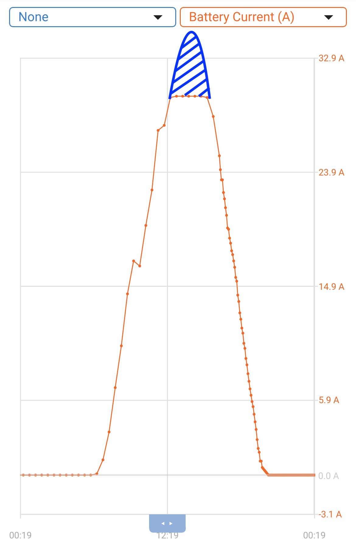 Den skarpsynte ser ganska fort att vår MPPT är lite i underkant av vad våra solpaneler ger, det är ett medvetet val då vi uppgraderat från 2 paneler till 3 och ger numera max laddning under så kort tid per dag (3-4 timmar) vilket gör att vi bara “förlorar” 15-20Ah laddning pga att den blå toppen av laddkurvan klipps av.