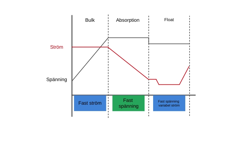 Sammanfattningsvis ser det ut såhär: Bulk laddar upp till 13,8V Absorption håller 13,8V tills laddningen sjunker under 2A. Float fortsätter hålla 13,8V tills spänningen sjunker 0,5V till 13,3V vilket är vår re-bulk voltage offset som triggar en ny bulk cykel. Det sker i regel endast under nätterna eller riktigt tråkiga dagar utan sol.