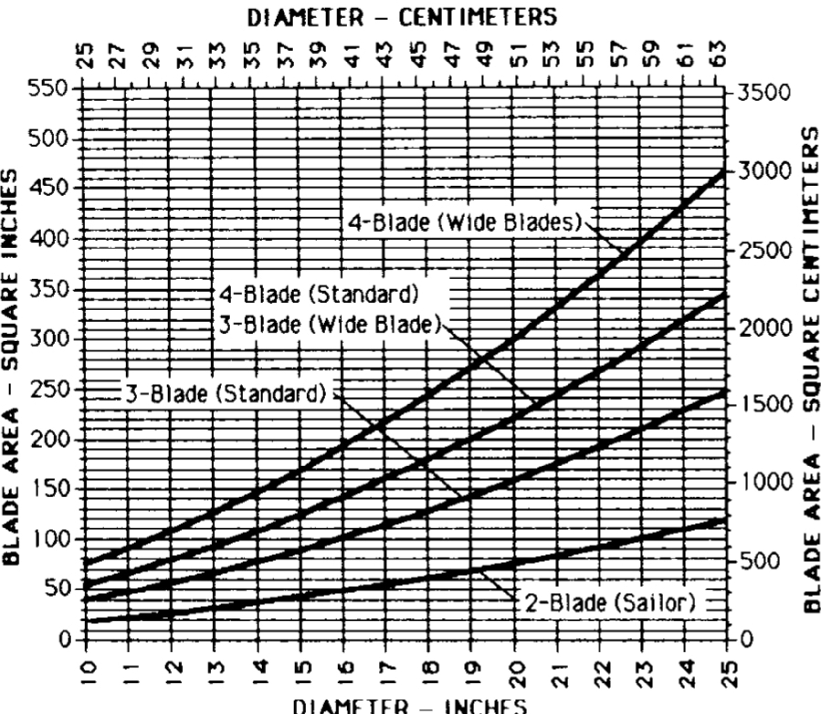 \[Bladyta = \frac{100 \times 65}{7{,}44} \times \sqrt{7{,}44} = 320 \text {tum}^2\]Det är förstås inte bara att knacka på hos en propellertillverkare och säga: “Hej, jag vill ha en 20-tumspropeller med en bladyta på 320 tum².” Eller jo, det kan man kanske – men det innebär med största sannolikhet att propellern måste specialtillverkas, vilket lär kosta skjortan. Ett alternativ är att istället fundera på om man ska välja en 2-, 3- eller 4-bladig propeller. En propeller med fler blad har en större yta och det finns diagram likt den nedan som kan användas för att hitta rätt. Värt att tänka på är att utvecklingen av propellrar inte står still så det som var rätt 30 år sedan behöver inte vara det idag vilket du märker om du studerar bilden nedan lite närmre efter du läst klart hela texten.