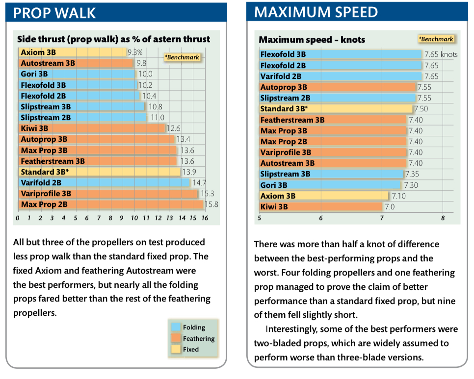 Efter lite letande hittade vi ett djuplodande propellertest från Yachting Monthly, publicerat i maj 2009. Inför testet bad tidningen ett antal propellertillverkare att rekommendera den bästa propellern för deras testbåt. Därefter testades varje propeller på samma båt och under samma förhållanden. Resultatet visas här:
