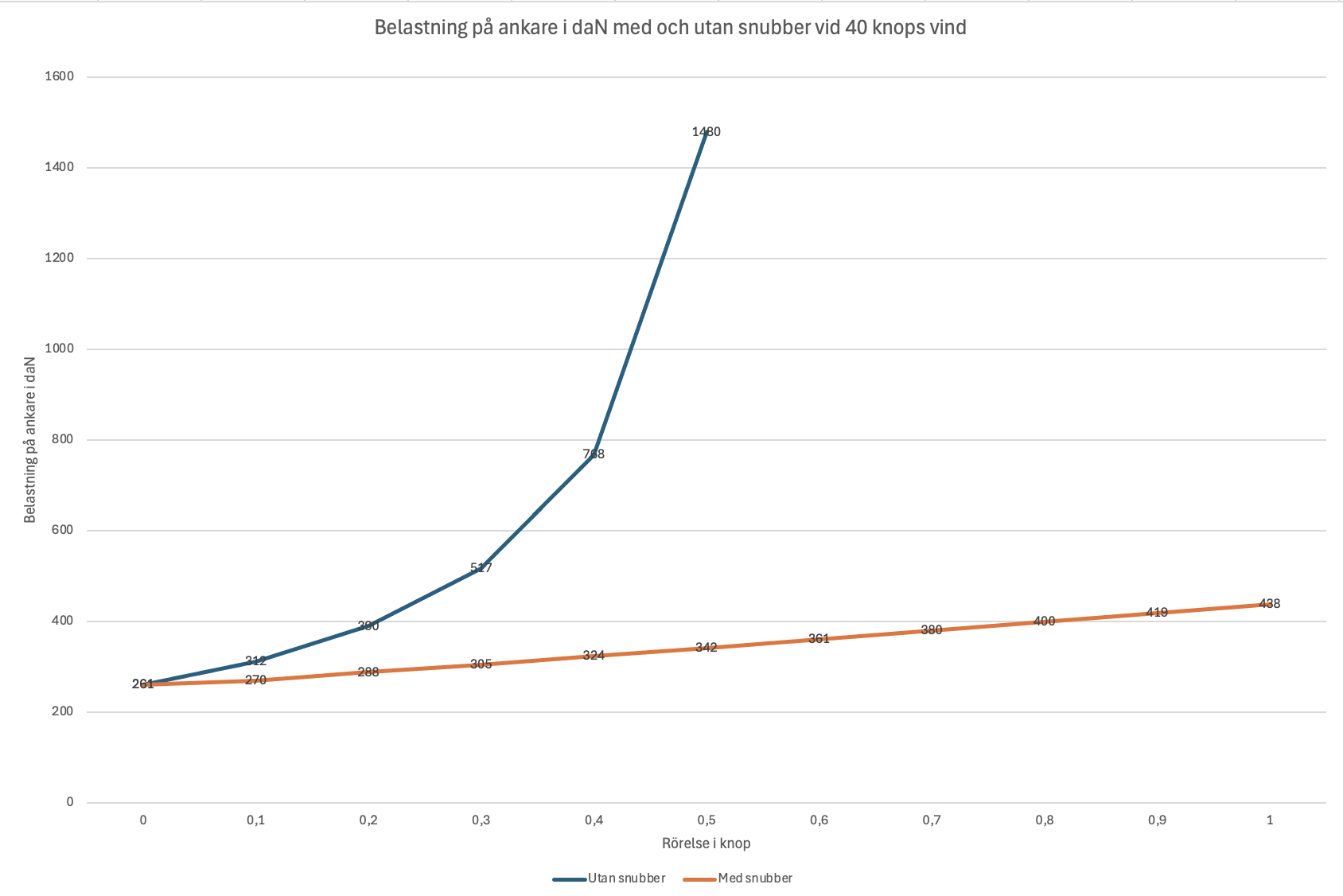 Grafen nedan visar belastningen på Freyas ankare med och utan snubber vid 40 knops vind, 8 meters djup och 60meter kätting. Snubbern i det här fallet är 10 meter lång och flexar 1.8m