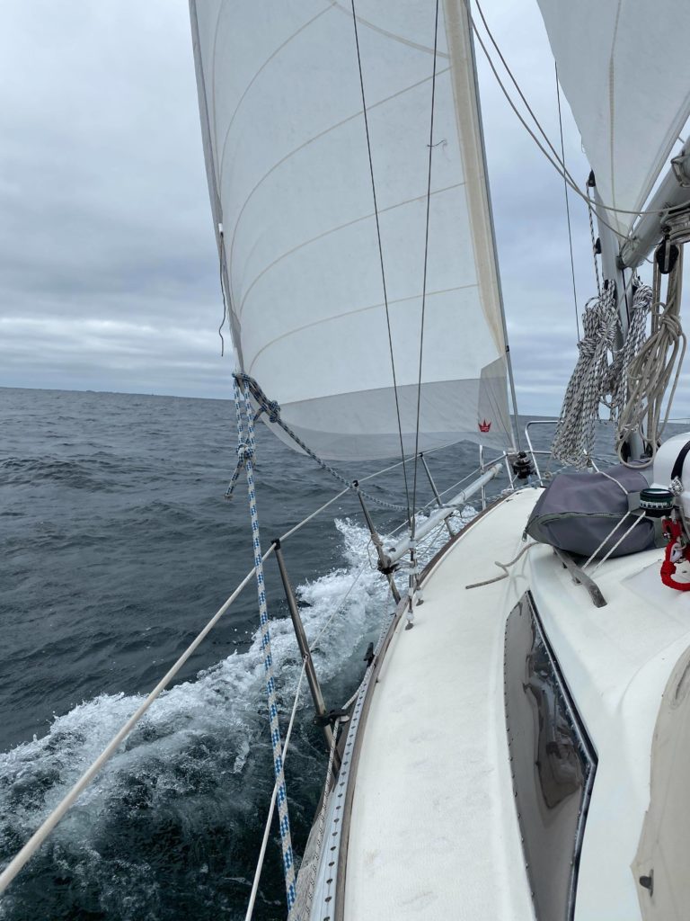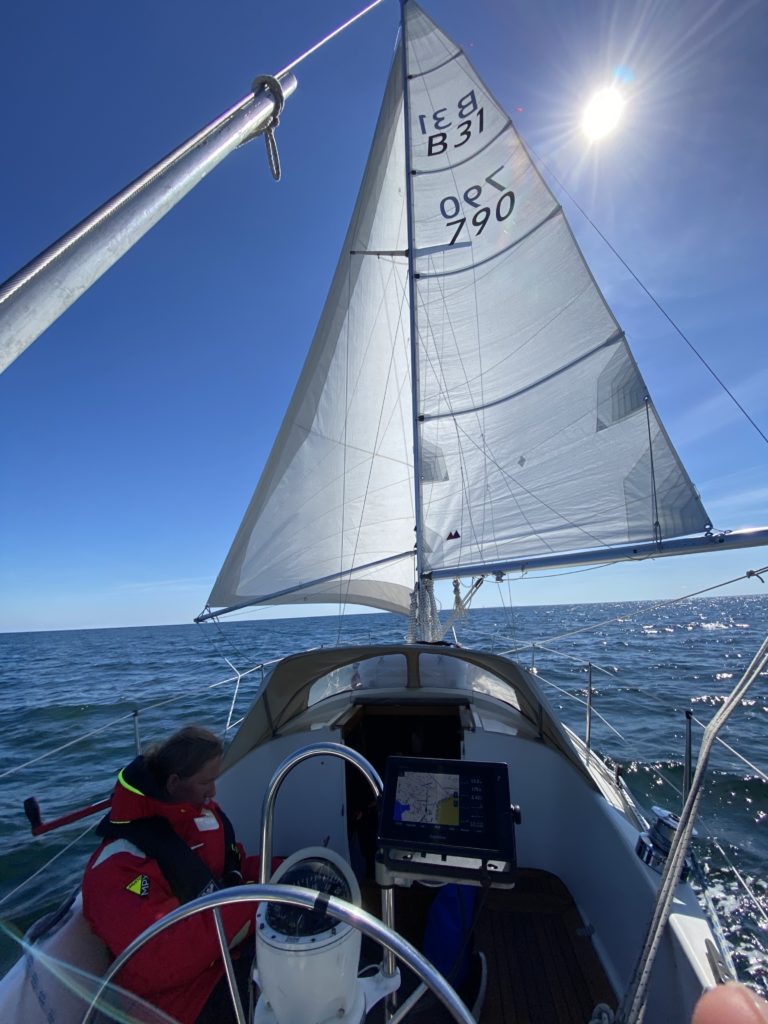 Första dagen förvånade oss med trevlig segling och ett riktigt toppenväder, under de första timmarna kunde vi till och med klämma ur över 6 knops fart ur den gamla damen vilket inte är så illa med tanke på hur tungt lastad hon är.