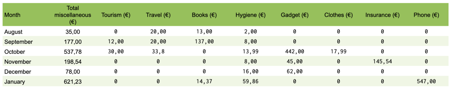 This category is everything that doesn’t fit into the other categories but to keep some kind of track of it we have split it into the following subcategories: tourism, travel, books, clothes, hygiene, gadgets, insurance and phone. Total amount spent on miscellaneous was 1648 € split into the different subcategories it was as follows: