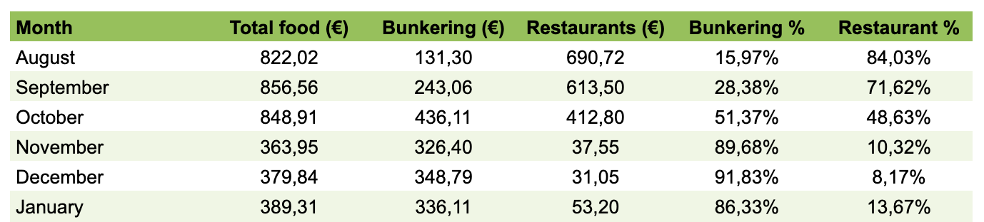 Monthly food costs split into bunkering and restaurants in € and percentage of month