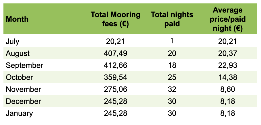 Total mooring fees per month and average fee per paid night
