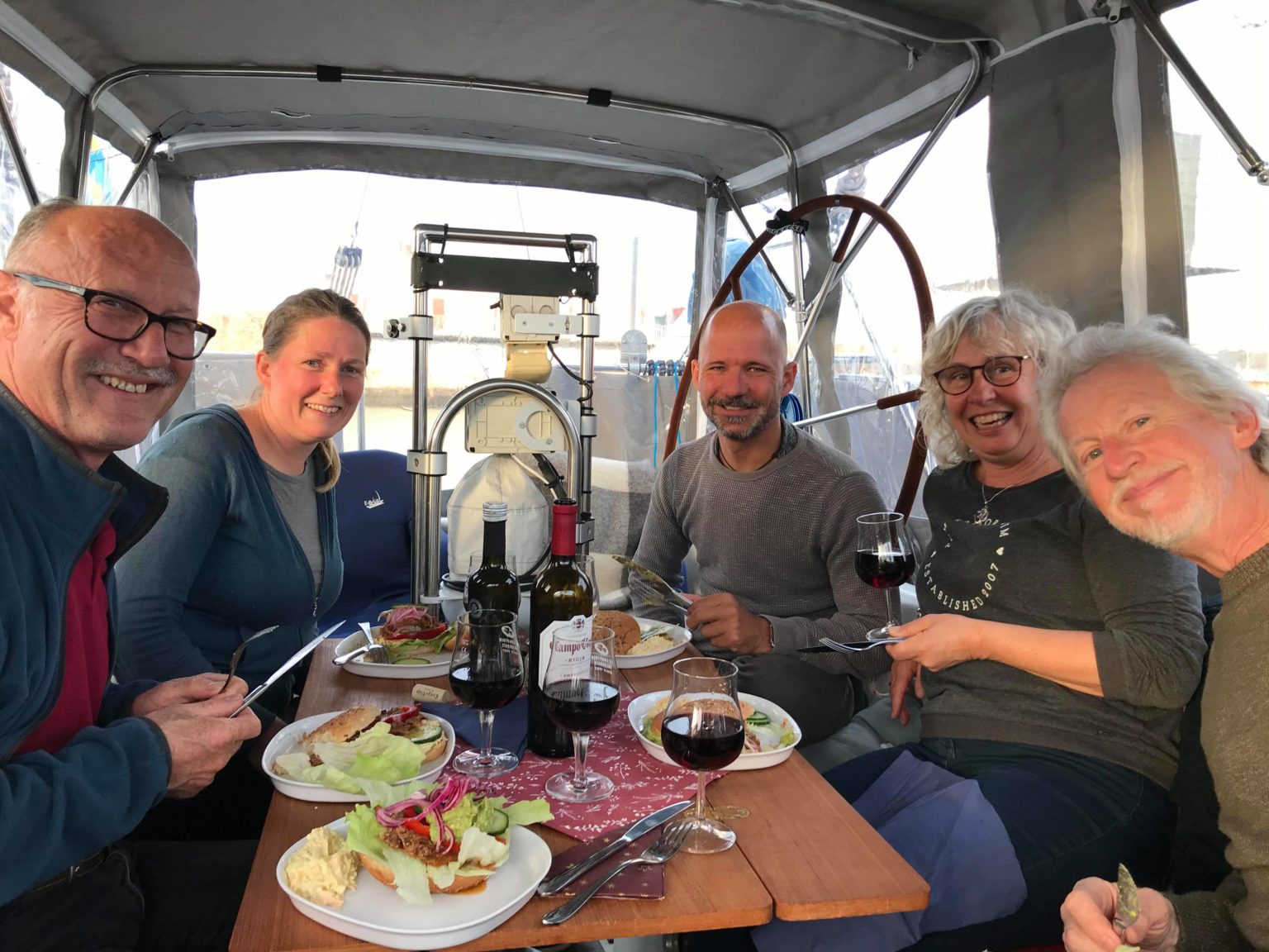 From the left Danilo, Mia, Tony, Berit, Richard and Karin behind the camera having dinner on Beyond