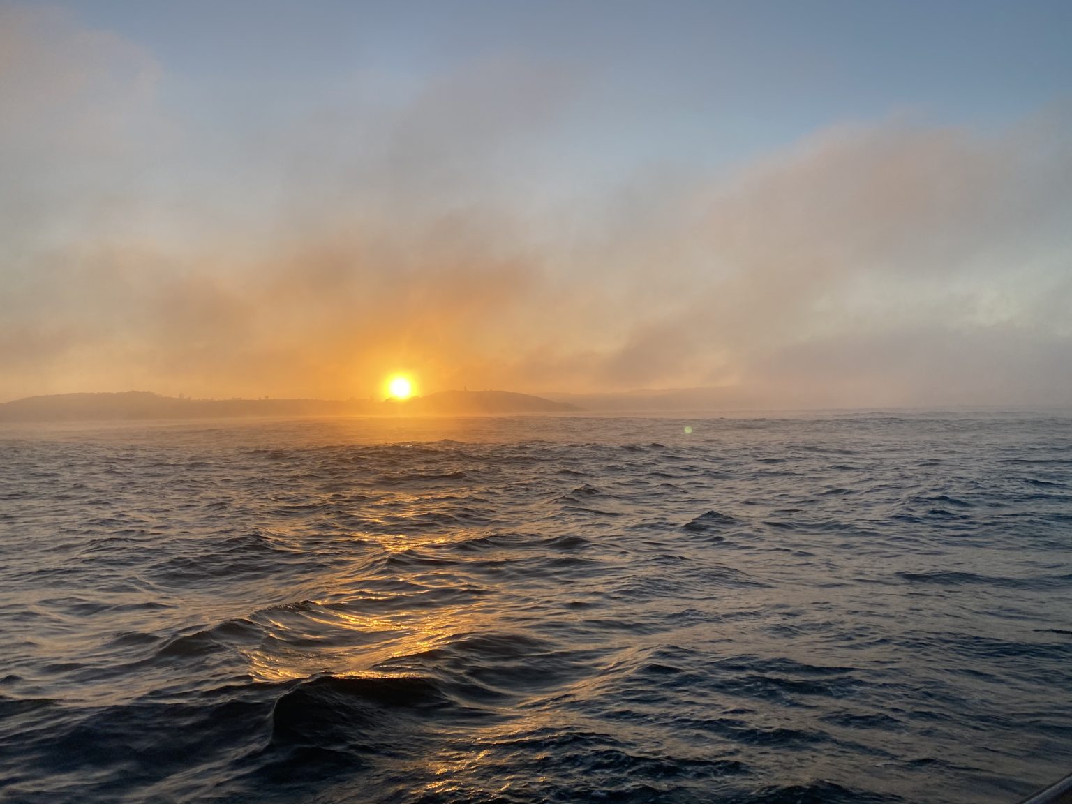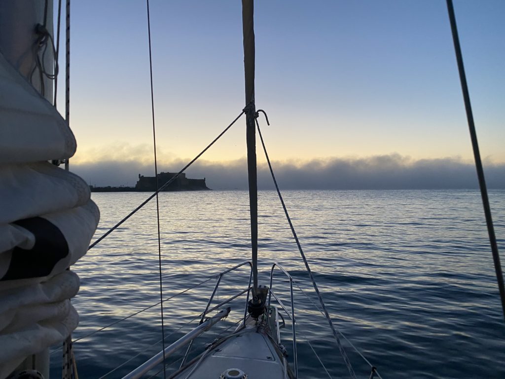 We left the marina in A Coruña at dawn and the other two Swedish boats, Beyond and Corsico, left at the same time. There are two marinas next to each other in A Coruña and we were not in the same marina. The only way to see that the other two boats were on their way out at the same time was by looking at the AIS. There was a dense fog so we couldn’t see each other until we got really close. For us that dense fog was a new experience but we had been warned about fog in the Spanish rias and along the Portuguese coast. Because of that we bought a fog horn the other day. We had a can with pressurized air and a horn on it but if there is a lot of fog to come we didn’t want to risk using up the can so now we also have a manual fog horn that you blow in. Thankfully on this occasion the fog cleared up quite quickly and gave us a beautiful sunrise instead.
