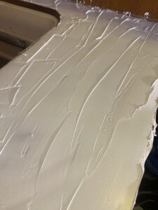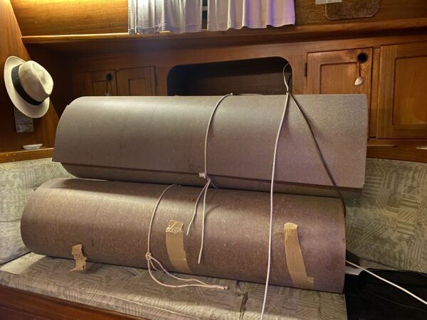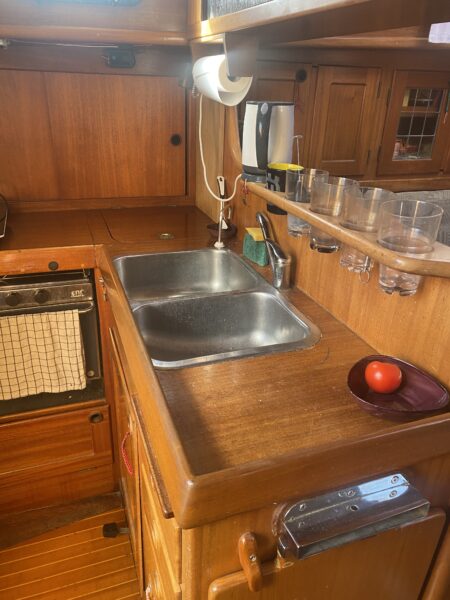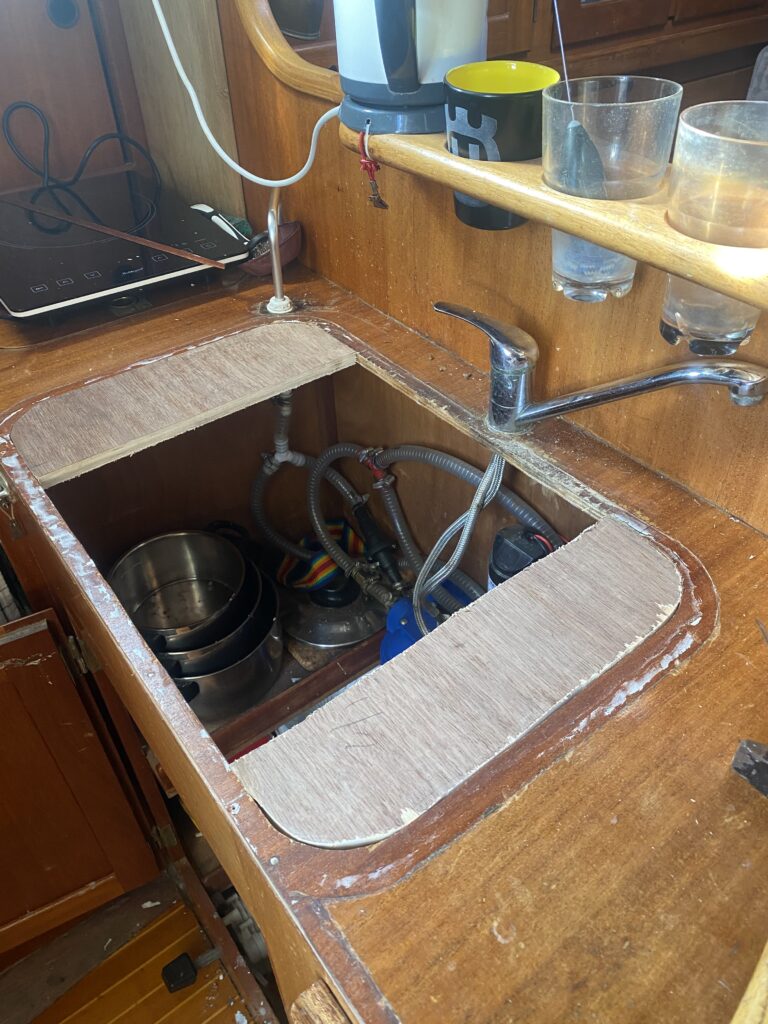 Efter många mail fram och tillbaks med Formicas återförsäljare på Sicilien som inte kunde mer än “Hello” på engelska slutade det hela med att vi, på italienska, lyckades beställa tre vita skivor (de ska även räcka till att piffa toaletten/badrummet) för 160€ + 50€ i frakt som efter någon vecka låg så fint i båten och tog plats.
