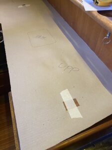 Efter att bänken var snickrad sågad och klar var det bara att rulla ut papp och rita mallen, tydligen är laminat lite besvärligt att lappa så man bara får en chans att såga. Planen var att kapa så lite som möjligt och göra skivan nåååågot större än vad bänken där det går för att använda en överhandsfräs till att fixa till kanterna.