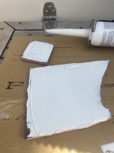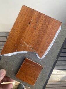 För fastsättning valdes Biltemas Multibond (inte Multibond Rapid!) som inte hugger direkt men i stort sett biter på allt som finns. Testade med att både lägga strängar på ett par brädbitar och trycka dit ett par beställda provbitar av laminatet med gummiroller och att spackla ut limmet i olika tjocklekar. Det som passade bäst på Freya var att spackla ut limmet tunnt, det bet precis lika bra som ett tjockt lager lim fast det gick åt betydligt mindre. Efter limmet torkat testades att skada laminatet med både tappade knivar, kastruller och ett och annat hammarslag utan framgång vilket få ses som en vinst i val av laminat och metod. Ett tips är att beställa ett gäng olika provbitar från Formica även om de inte behövs för att välja laminat, de är perfekta att testa att såga, limma, böja, skruva eller slagtesta ytan på utan att behöva använda den “riktiga” skivan.