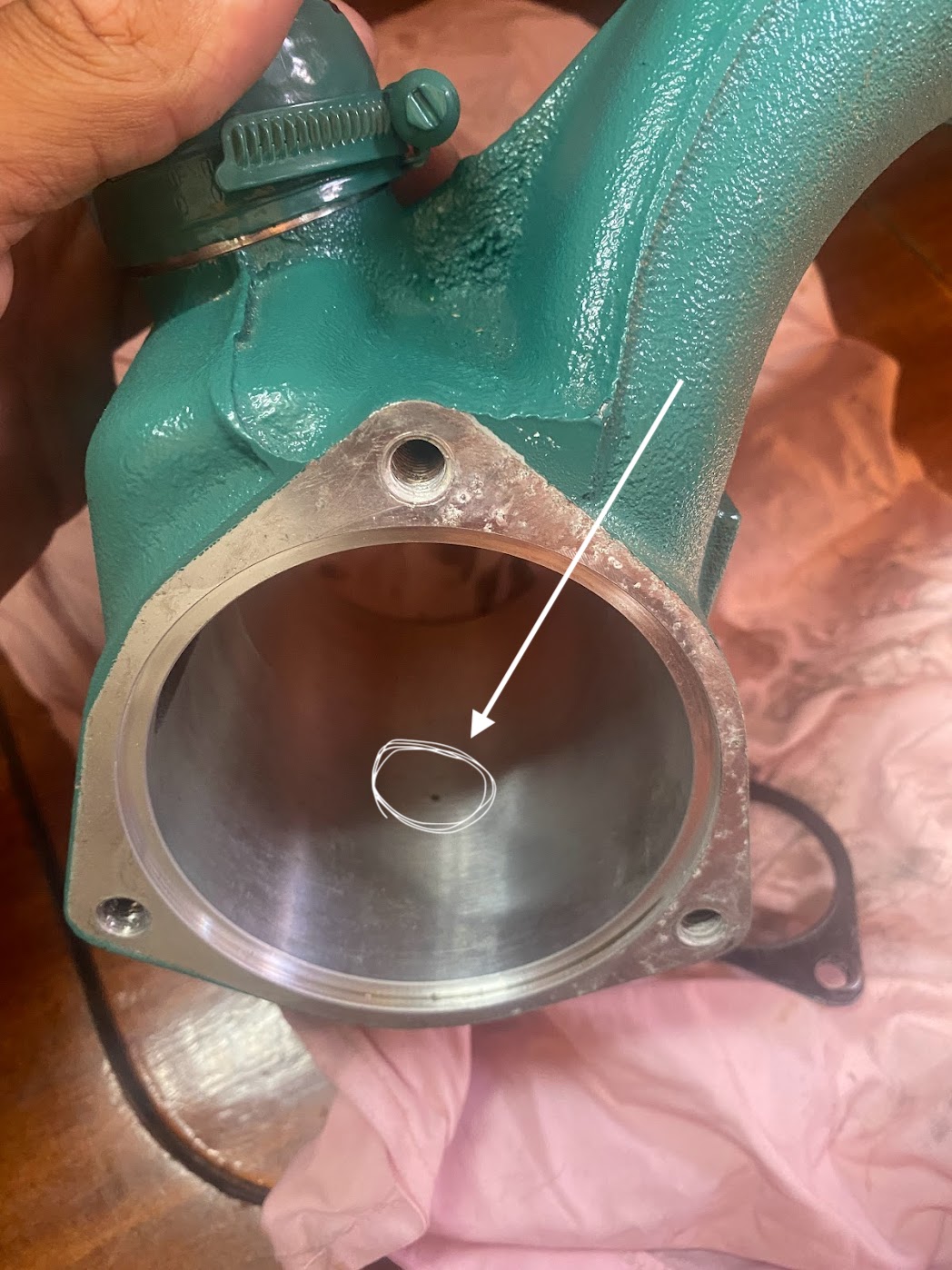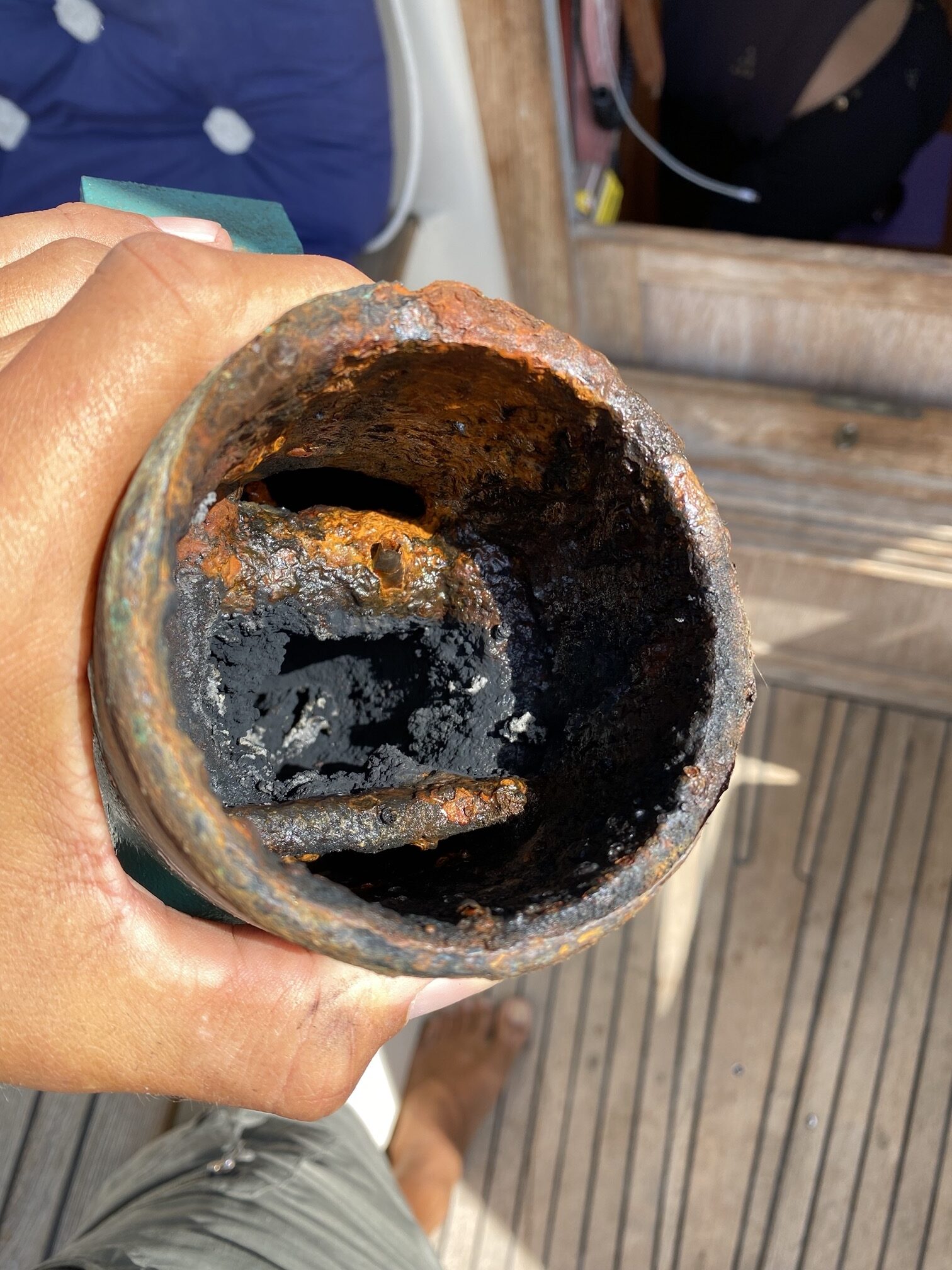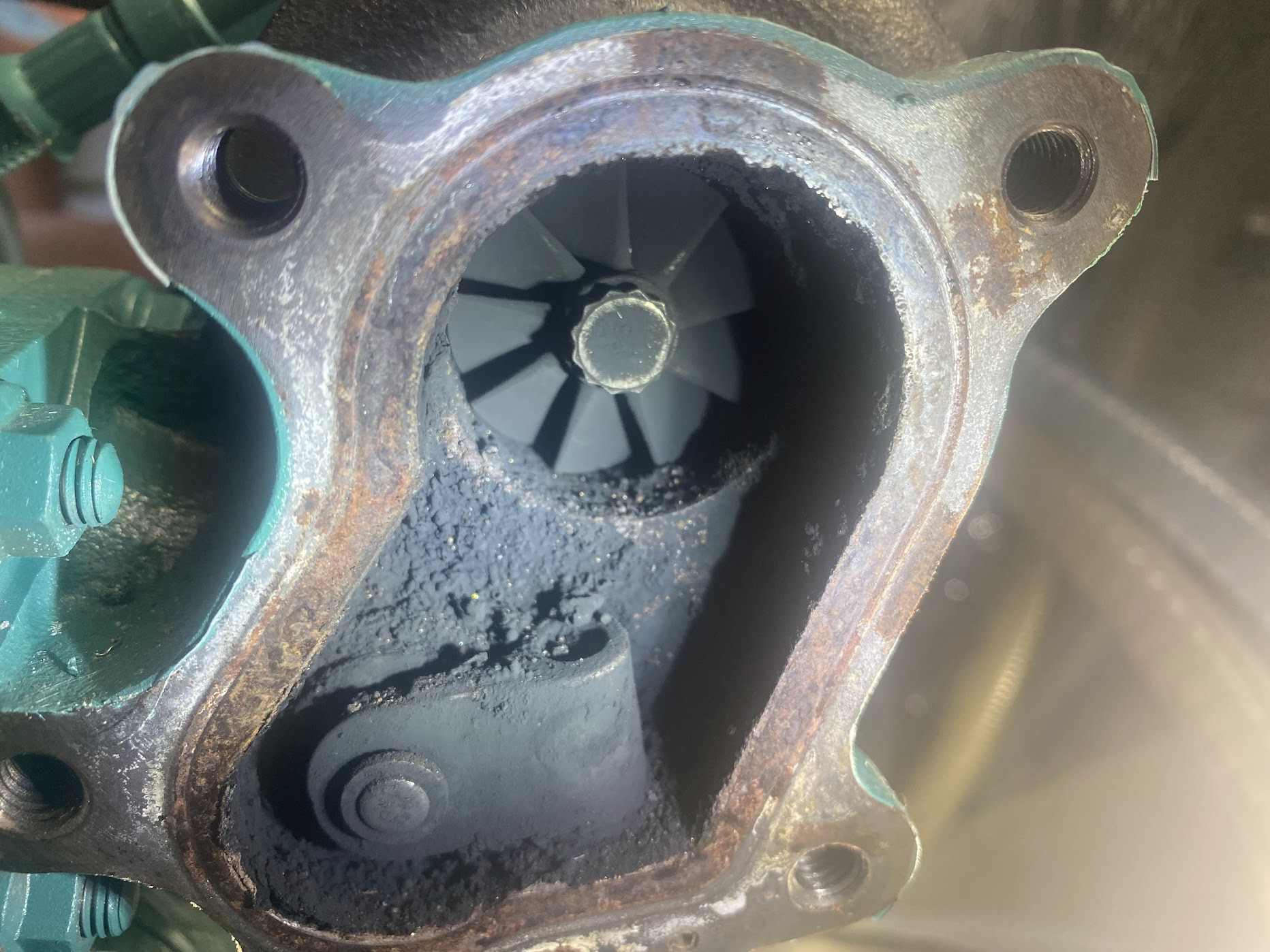 Värre var det med avgasknät, den var igenmurad av koks och elände vilket är ganska vanligt på den här modellen av avgasknä då inloppet till kylvattnet kommer lite för tidigt så att avgaserna kyls ner för effektivt vilket i sin tur skapar lite oreda och service behov. Det finns “kopior” i rostfritt där den som designat knät tänkt till som inte slår igen på något år och att de är rostfria får man på köpet. 🙂